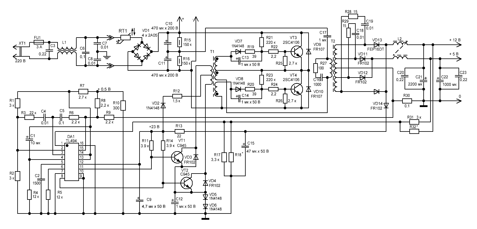 Все схемы построены по топологии АТ. Считаю с полным основанием, что дежурное питание для подобного сабжа, являющегося "вещью в себе", совершенно не нужно! Это ведь не компьютер, который должен находиться в дежурном режиме, чтобы иметь возможность включения по сети или звонку модема! БП АТ десятилетиями работали без нареканий.