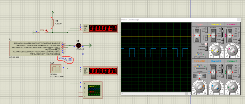 Подскажите, как заставить работать в протеусе микроконтроллер с включенным асинхронным режимом работы таймера1? Модель PIC12F1822. На выводы тактирования подключен часовой кварц 32768 Гц. Конфигурация и периферия настроены верно. В реальной схеме все работает, а вот в протеусе нет. Кварц вешать бесполезно, протеус не эмулирует. Нашел в моделях CLOCK, задал частоту 32768 Гц, тоже молчит. Подцепил к этой модели осциллограф, сигнала тоже нет. Единственное, что хоть как-то работает, если я подаю на вход тактирования DCLOCK GENERATOR, но симуляция очень медленная. В самой модели микроконтроллера нет пункта для ввода частоты внешнего тактирования. Есть только поле ввода основной частоты тактирования микроконтроллера.