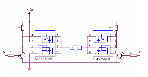 Возможно вопрос не самый умный, но есть проблема с мостом собранным по такой схеме AP4525GEM в качестве сборок, BC546 в качестве транзисторов. Проблема следующая , если подключить мост к питанию без нагрузки (двигателя ) то радостно перегревается одна или обе сборки AP4525GEM. Что я упускаю? не верно подобранные сопротивления ? или принципиально неверная схема ? Управление с мк просто подачей +5
