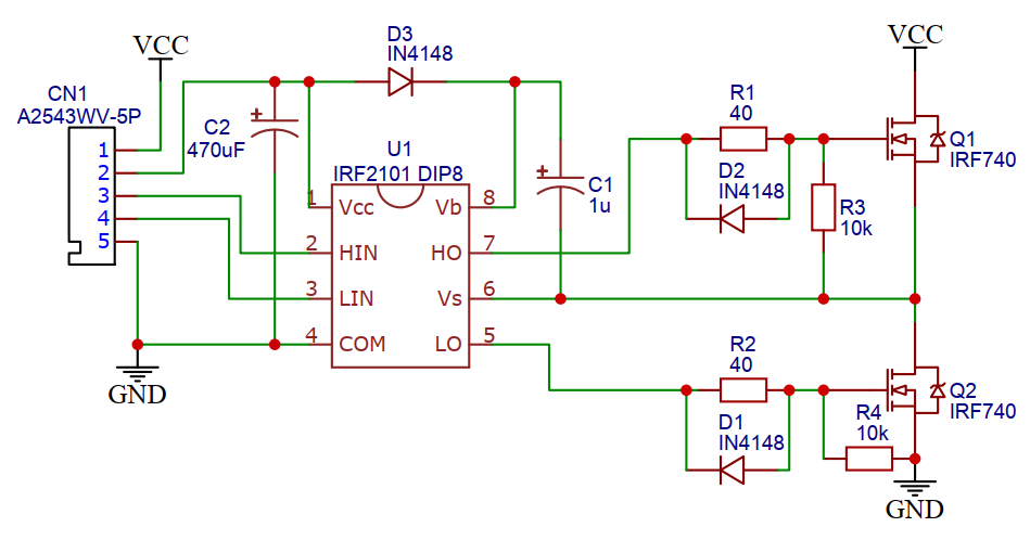 Здравствуйте, собираю Н-мост по схеме во вложении (схема взята из даташита драйвера). Номиналы все те же, кроме С1, его я ставил разными. Нижний транзистор открывается и закрывается отлично, а вот с верхним проблема: на затворе всего 3,24 вольта из-за чего транзистор открыт не полностью и сильно греется даже с минимальной нагрузкой, в качестве нагрузки ставил лампу накаливания. Пробовал разные номиналы бутстрепного конденсатора С1, от 0,1 мкФ керамического до 15 мкФ танталового. напряжение Vcc (постоянное) для опытов было 18 В, но в итоговом варианте должно быть 310 В. Питание драйвера - 12 В с БП от компьютера. Частота переключений 50 - 100 Гц. Не могу понять почему на затвор не приходит Vcc+Vc1, как должно быть в теории. Может мне кто объяснить где я ошибся?