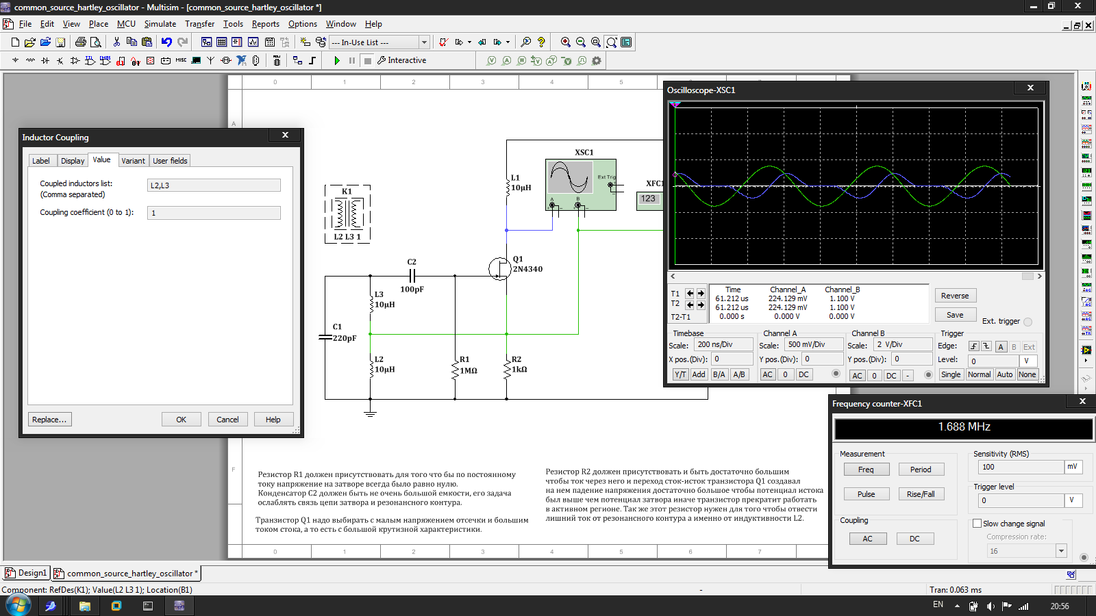 Как я понял из прочтения интернетов, в генераторе Хартли (она же схема индуктивной трехточки), можно разделить индуктивности (separate coils), необязательно чтобы они были как одно целое с взаимной индуктивностью. То есть две разных катушки индуктивности моя схема симулирует короче говоря.