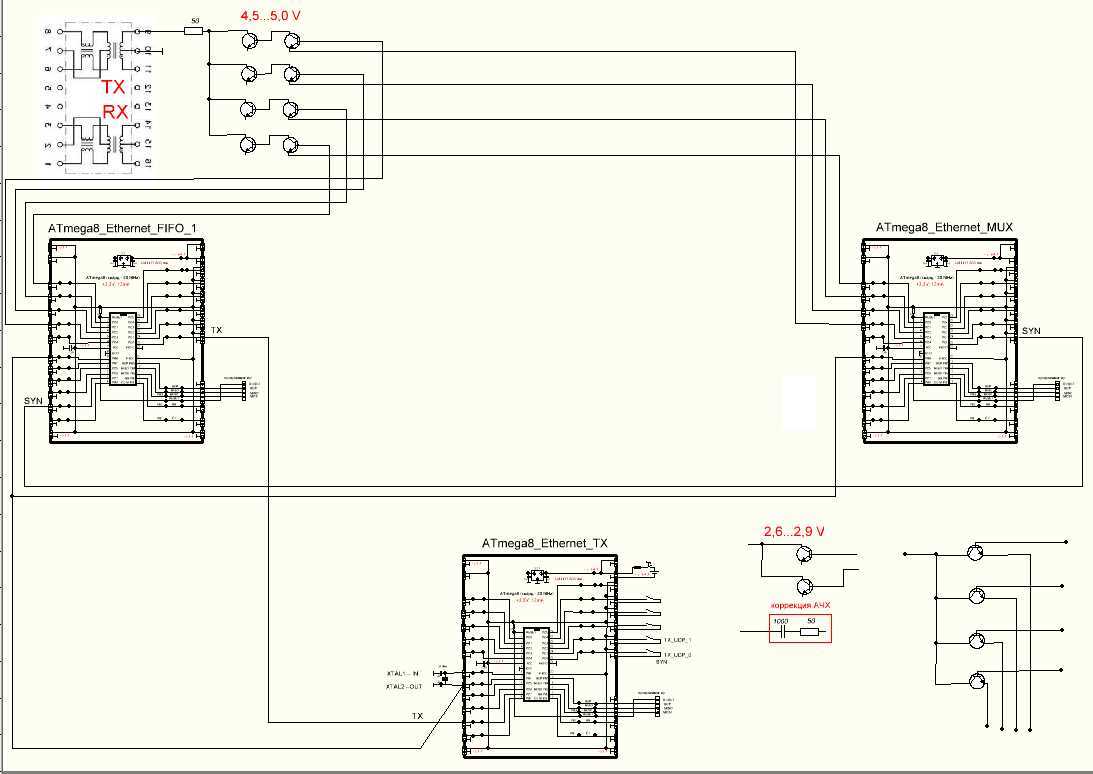 в тестах использовал только 2 МК... для проверки 2-x достаточно )) минусы: 1. работает не очень надежно... требуется точно подбирать напряжение питания... 2. 4-х МК многовато... вывод: нужна другая схема...