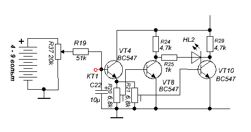 Вольтметр подключаем к контрольной точке КТ1, т.е. к базе VT4. Настраиваемся на любую радиостанцию. При этом видим, что при перестройке напряжение на КТ1 меняется. Нужно настроится на слух на станцию по наилучшему качеству звука. Попробовать покрутить немного ручку настройки сначала в одну сторону, потом в другую. Увидим, что напряжение будет изменяться. Например при наилучше качестве приема это напряжение 2,5 вольта. При вращении ручки настройки сначала в одну сторону, а потом в другую оно меняется к примеру в пределах 1,5 – 3 вольта. Если это примерно так, значит все нормально. Теперь собственно переходим к настройке нашего узла. Пусть при правильной настройке напряжение на КТ1 у нас 2,5 вольта. Верхний вывод резистора R19 отпаиваем и собираем такую схему.