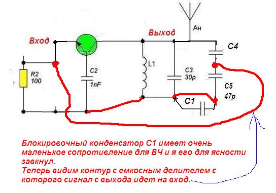 Так сопротивление катушки для звуковых частот практически ноль, а сопротивление С2 очень большое для ЗЧ. Вот закороти её и выброси С2 и сразу увидишь, что для ЗЧ каскад является эмиттерным повторителем, т.е каскад с ОК, а по ВЧ он является каскадом с ОБ. Только не забивай пока голову по ЗЧ. Это же только к жуку относится, а не к схеме генератора..