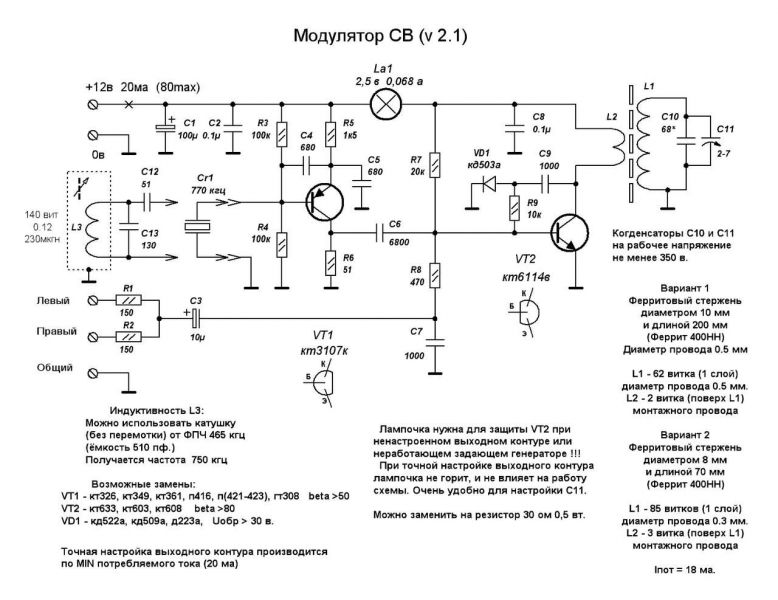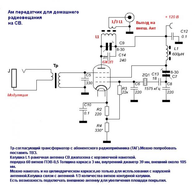 Простой АМ передатчик на 600 кГц. Мощность... не указана)) Антенна - отрезок провода длиной 2-3 м. Дальность действия 25 метров. Приёмник - обычный средневолновый радиоприёмник.