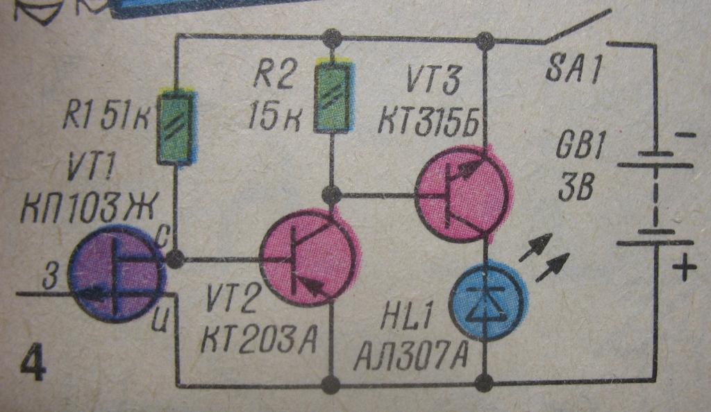 Отпаял затвор полевого транзистора, оставил его висящим в воздухе, светодиод также светится. Осмотрел еще раз плату на замыкание - ничего. Как было написано ранее в этой теме, уменьшить чувствительность, можно обмотав элемент питания общим проводом (массой)вокруг него, по окружности (в моём случае это таблетка от материнки). Обмотал, сделал витков 5. (-), как я понимаю, это и есть масса ? Никакого результата. Светодиод в моём случае горит, это как я понимаю, значит, что биполярные транзисторы работают как надо ? То есть, открываются и проблему надо искать в полевом транзисторе ? Плату тоже не травил, а отделял участки резаком.
