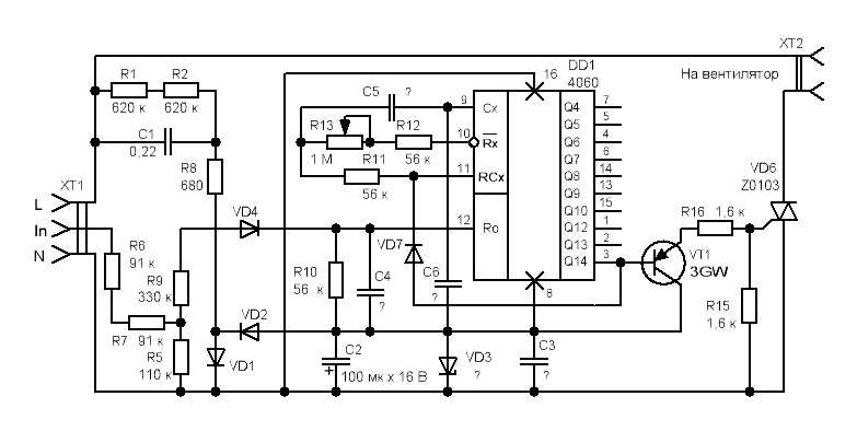 Да, счетным путем действительно удобнее. Только я бы рекомендовал единственный корпус 4060 - в нём уже и тактовый генератор имеется. Вот схема таймера для бытового вентилятора "Домовент-100С". Хочу обратить внимание на диод VD7, который прекращает дальнейшую работу генератора при окончании счета. А выход лучше брать с предыдущего разряда - как раз отработает свою 1 с и "заткнется". Схема срисована с платы, поэтому нет номиналов SMD-конденсаторов. Её, конечно, нужно доработать для данной задачи, но основные узлы на ней есть (кроме выхода на симистор, который нужно заменить ключевым транзистором, нагруженным на оптрон).