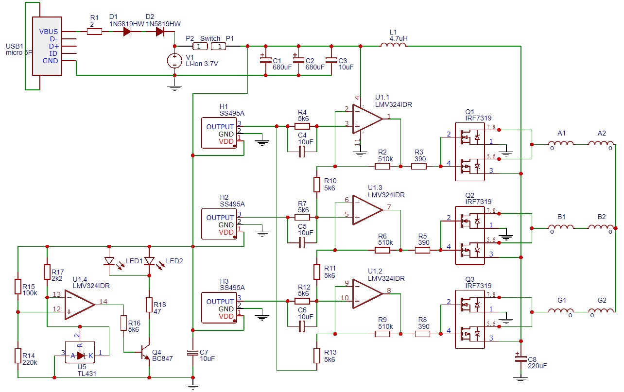 Пока модерировался мой предыдущий комментарий почитал форум и вроде как почти все вопросы отпали. Накидал тут схему в приложении, где можно легко разводить платы с шелкографией и последующим заказом на изготовление (т.к. для ЛУТа нету ни текстолита, ни принтера, ни реактивов для травления). По поводу схемы есть пара вопросов: 1. Зачем ещё один конденсатор C8? Он же по сути параллелен питанию, там и так хватает ёмкости. 2. Я правильно понимаю, что блок со светодиодами (R14-R18, C7, tl431, bc847 и 4-ый ОУ), что слева внизу на схеме, нужны только для индикации разряда аккумулятора? И получается его можно убрать без потери работоспособности? 3. Почему минусовой вход 3-его ОУ, участвующего в управлении электромагнитами, соединяется с плюсовым входом 1-го ОУ через R4-C4, а не напрямую? Как это сделано между 1-м и 2-м, 2-м и 3-м ОУ. На схеме по питанию от USB специально стоит 2 диода, т.к. не нашёл у себя диодов с падением напряжения больше 0.4В, два конденсатора по питанию на 680 мкФ тоже специально, т.к. они танталовые (как-то покупал пачку на 10 штук, ещё есть и лежат без дела).
