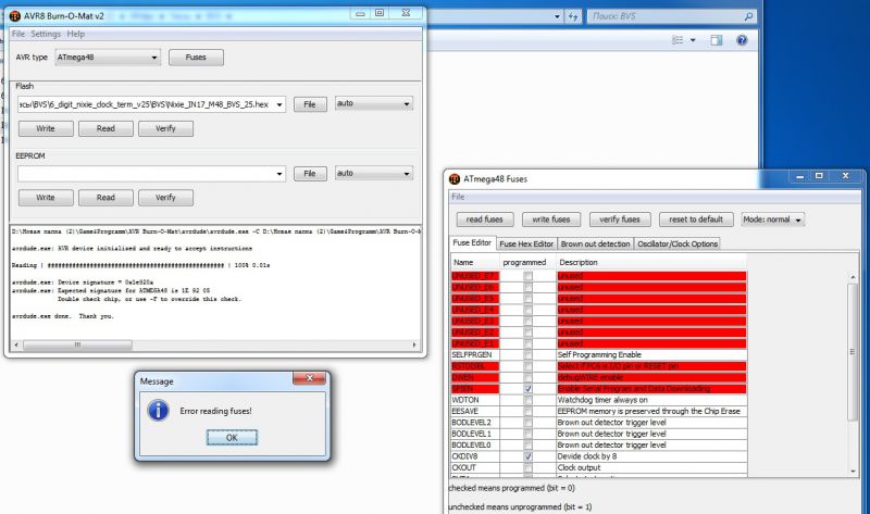 Добрый вечер всем. Есть два новых камня из магазина(купленых в разное время) Atmega 48. Есть программатор USBtiny с панелькой DIP28 для контроллеров atmega8. Так вот меги8 прошиваю AVR Burn-O-Mat на ура, без проблем, а как только ставлю мегу48, в проге выбираю её и пытаюсь считать, прошить фьюзы светодиод на программаторе моргнет и программа выдают ошибку. Вроде выводы при программировании у меги8 и меги48 совпадают. Мегу48 шью в первый раз, так что может есть нюансы какие? Что я мог недосмотреть и что делать?