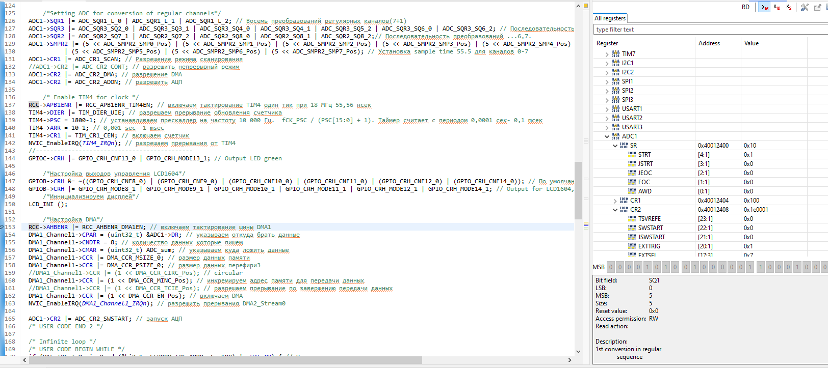 Что может быть не так? АЦП-ДМА после завершения передачи зависает в прерывании, это я так понял. По переводу-"получено неожиданное прерывание", но так и не понял что это значит. В описаниях режимов у F407 и F103 для моего случая не нашел. Но 407-й работает, а 103-й виснет.