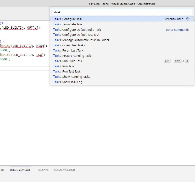 Теперь сохраняем все файлы, жмем в главном меню VS Code "Terminal", там давим "Run Task..." и в строке в верхней части редактора видим выпадающий список, в котором присутствуют две задачи: blink_compile и blink_upload.