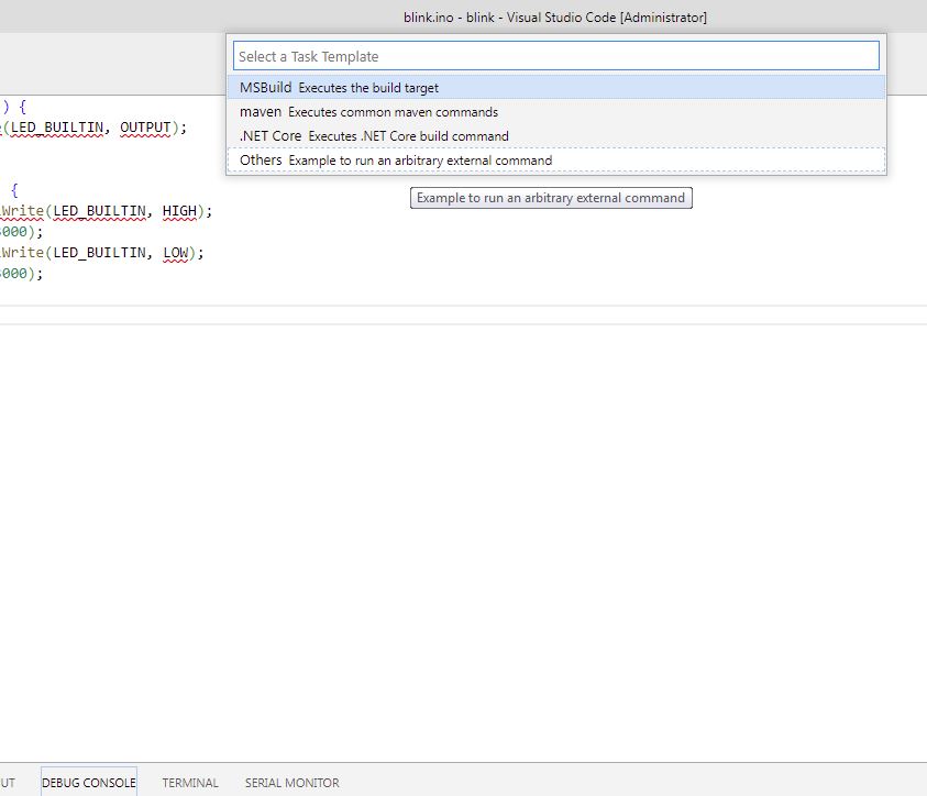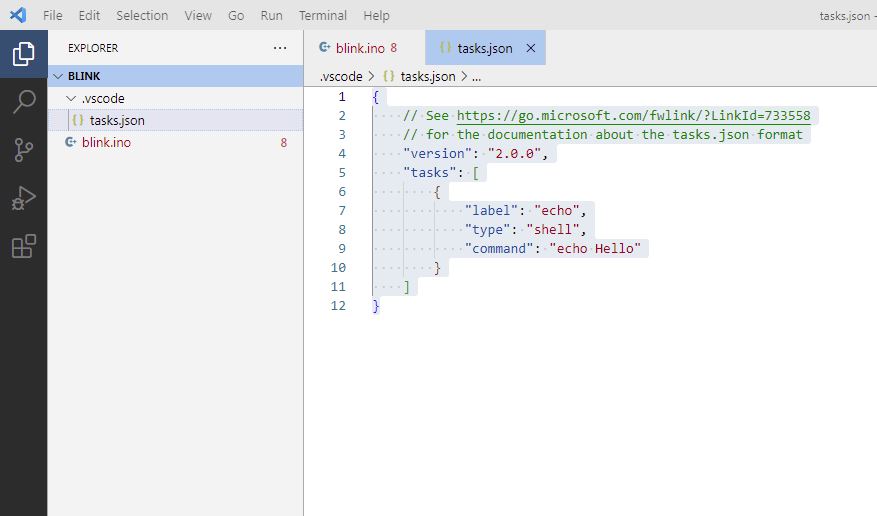 В папке с проектом blink редактор VS Code создаст папку .vscode а в ней файл tasks.json. По сути текстовый файл, с шаблонным текстом кода правка которого позволит нам передавать необходимые команды в командную строку Windows.