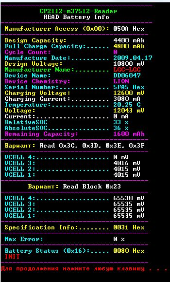 2. Тот же момент касается зарядных токов - контроллер запрашивает 3420мА при заряде, что слишком много для сборки из двух батарей с зарядным током 1589мА (0.7с) по спецификации. Есть ли нынче информация по данным моментам, или дамп епром батареи с более обиходными элементами? Если EDV0 еще ладно, то с завышенным током заряда АКБ долго не проживёт.