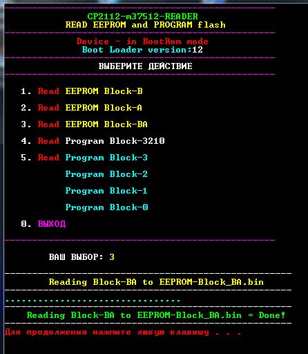 Привет всем!... Ещё один подарок пользователям CP2112: CP2112-m37512-READER Читает Bat-info Считывает Данные Блоков В, А, 3, 2, 1, 0 Блоки В+А и 3+2+1+0 Целыми Кусками... Стирание Блоков В и А Запись Блоков В, А, ВА, 3+2+1+0 Целыми кусками... Все работает на WIN-7(x32)