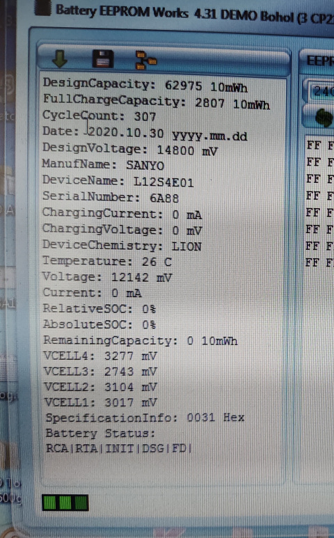 Добавлено after 19 minutes 5 seconds: Помогите восстановить аккумулятор от ноутбука с контроллером BQ8050A. Долго лежал разряженным, сейчас не заряжается. Фото из be2works прикрепил, посмотрите пожалуйста по флагам, контроллер заблокировался? Флаги RCA, RTA, INIT, DSG, FD