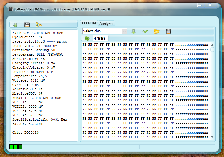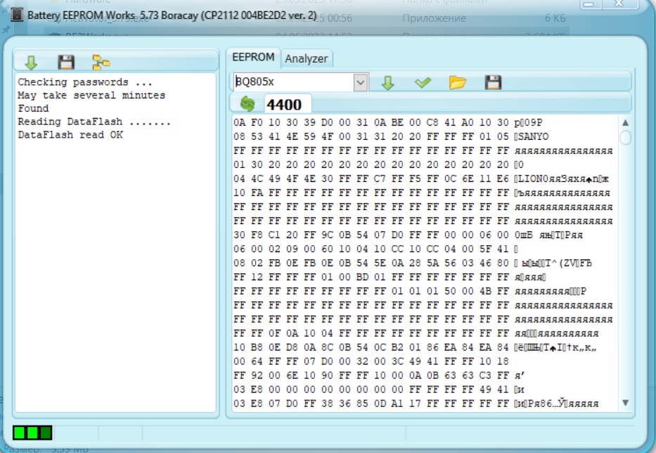 Здравствуйте форумчане, хотел бы поделится своим опытом разблокировки АКБ Dell G5M10 на чипе bq30420 (Firmware: Samsung SDI v3.19). Сперва дисклеймер: Не воспринимайте этот пост как гайд, я в этом деле полный ноль, занимаюсь этим лишь для себя, по этому могу где-то сильно ошибаться, так как в ходе этих экспериментов я все-таки сломал один чип bq30420 залив нечаяно в него прошивку из bq30423, благо у меня был один чип в запасе. Я просто хочу поделиться полученной информацией, так как вроде не нашел тем на русскоязычных форумах по этому АКБ с этим чипом (возможно плохо искал) И так, лежал у меня аккумулятор, у которого из-за долгого пролеживания банки ушли в глубокий разряд, на них в момент разборки АКБ было примерно по 2.2 Вольта, контроллер соответственно заблокировал полностью АКБ на заряд и разряд, предохранитель к счастью целый оставил. Аккумуляторы тоже никак не пострадали, ни намека на вздутия и т.д., по этому я отпаял плату с контроллером (начиная от + к -), а сами банки кинул на подзарядку на ЛБП током 50мА до 3.3В, а потом уже током 300мА догнал до 3.6В. Все манипуляции с чипом, что описаны ниже я проводил с "эмулятором" аккумуляторов на резисторах и ЛБП. Ок, первым делом я прочитал отчет по чипу с помощью be2works, скрин с отчетом я прикрепил ниже, в разделе Battery Status пустота, FCC = 0mAh, CC и CV = 0, при том что в этот момент пин SP был замкнут на землю. Потом не отходя от бэшки решил вычитать прошивку из чипа, но как оказалось ни одна версия be2works ломаная мной, будто 5.50, 5.73 или 5.93 и т.д. не смогли вычитать прошивку, просто "Reading Data Flash..." и через пару секунд "ERROR", на этом все (при этом прошивку из АКБ G5M10 на чипе bq30423 что стоял в моем ноутбуке они читаю нормально). Короче, бэшка в этом вопросе - бессильная. Кстати, чтения прошивки из чипа bq30420 с прошивкой от Samsung SDI надо проводить с разомкнутым контактом SP от GND, об этом прочитал в одной из тем на форуме NLBA1 по этому АКБ, без этого действия чип даже не распечатается, а в бут тем более не войдет. И так, благодаря одному хорошему человеку у меня есть K.N.N Beta 0.4.3.4 и она как раз и подняла этот АКБ с этим чипом. Попробую подробно описать как это вышло у меня. Для чтения прошивки запустил саму KNN и перешел сразу во вкладку "BQ304xx", нажал "Read Status" где программа показала статус чипа и его название, в моем случае чип имел статус "Sealed", по этому следующим шагом было распечатать чип, этого мне удалось добиться нажав на "FULL", нажатие на "Unseal" ничего не давало. Ок, после этого мой чип распечатался (статус "UnSealed"), после этого я сразу отправил его в boot mode соответствующей кнопкой, после перехода в бут режим уже смог вычитать прошивку и сохранить ее. Далее этот дамп закинул в хекс редактор (я юзаю HxD) и отредактировал один байт по смещению 0х0129, был "01", а стал "00" (прикрепил скрин где это находится "FIX Firmware"), после заливки исправленного дампа в чип той же KNN Beta АКБ ожил. Важно! После прошивки надо вывести чип из бут мода кнопкой "Exit Boot" и нажать "Reset Chipt", в моем случае он автоматически запечатывался обратно и на колодке сразу появлялся потенциал после замыкания SP на GND, возможно правильнее перед "Reset Chip" еще нажать "Seal Device" а потом уже ресет... Опытные в этом деле напишите как правильнее Возможно вы задались вопросом, откуда я узнал где править тот самый байт в дампе, чтобы АКБ начал работать, так вот, всю нужную информацию я добыл читая темы по этому же АКБ на форуме NLBA1. Надеюсь здесь можно прикреплять ссылки 